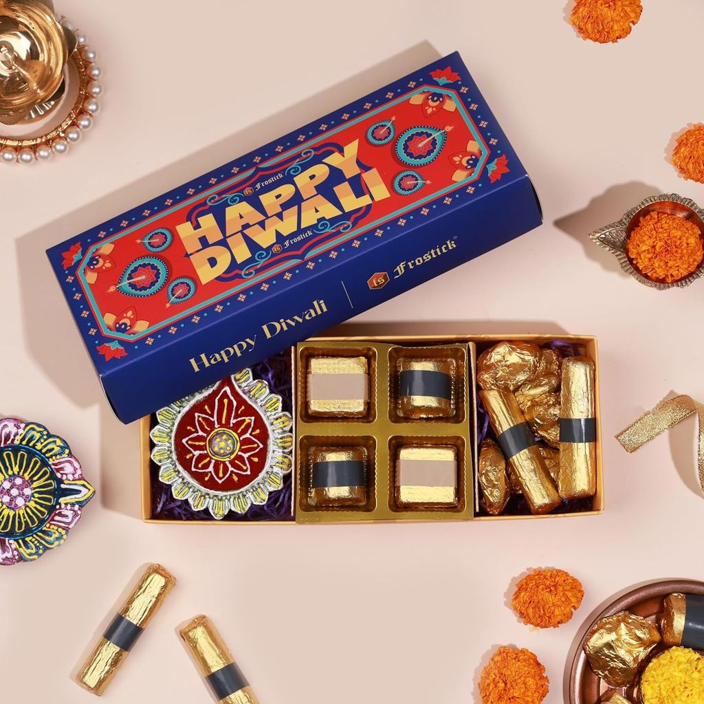 Paired with it is the Happy Diwali Gift Box, filled with luxurious chocolates, festive sweets, and a decorative diya — making it a delightful treat for your loved ones.