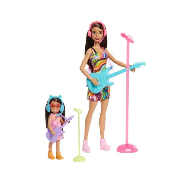 Barbie® doll and her little 'sis Chelsea® doll are topping the charts as a pop star duo with this Barbie® pop-star-themed sisters playset. Ready to hit the stage and perform, Barbie® (11.5 in) and Chelsea™ (6 in) dolls are dressed in colorful sleeveless dresses with a star print pattern, plus colorful shoes to match. Each doll commands the stage with their own guitar and microphone, plus stand and headset microphone. Chelsea™ doll also comes with a cute pair of star-shaped sunglasses. Kids will love the endless possibilities for creative expression and storytelling fun! For ages 3 and up. Dolls cannot stand alone. Colors and decorations may vary.