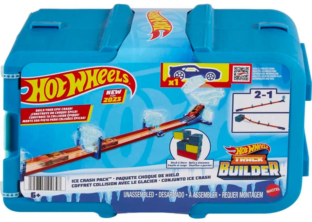 Create a cool track build with the Hot Wheels Track Builder Ice Crash Pack track set. The set includes 10 track-building components with ice-themed flippers and a large ice wall for chilling crashes. All pieces fit inside the innovative modular storage box that can also be used in track configurations. One Hot Wheels car is included, and the pieces can be used interchangeably with other sets. Makes a great gift for kids 4 years old and up. Colors and decorations may vary.