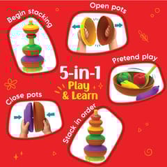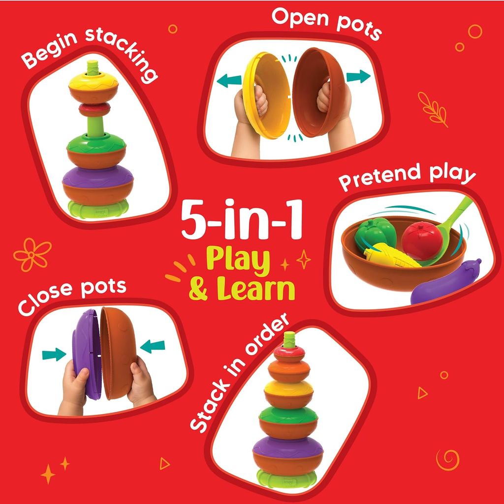 • 5-in-1 Early Learning Toy – Kids can stack, nest, build, learn numbers & colors, and explore pretend play with this fun and colorful stacking pot set.