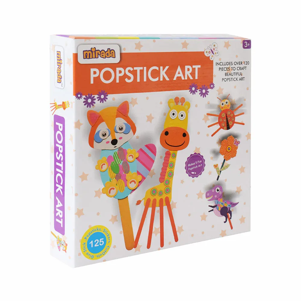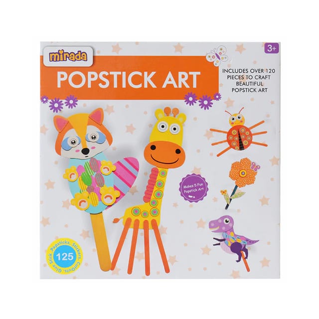 • Make a giraffe, ladybug, fox, flowers, and dinosaur with pop sticks! Make five fun projects with pop sticks, lots of stickers, paper shapes, glue stick and easy step-by-step instructions. Each project is individually wrapped Includes 125 pcs of stickers, paper shapes, pop sticks, glue stick and easy picture instructions sheet.