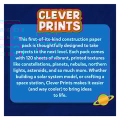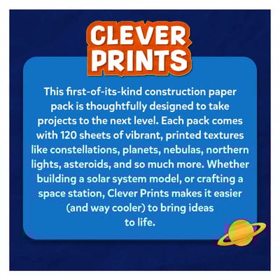 This first-of-its-kind construction paper pack is thoughtfully designed to take your projects to the next level! Each pack comes with 120 sheets of vibrant, printed textures like constellations, planets, nebulas, northern lights, asteroids, and so much more. Whether you're creating a model of our solar system or crafting your own space station, Clever Prints makes it easier (and way cooler) to bring your ideas to life.