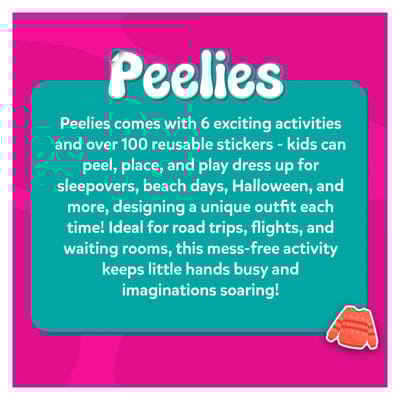 Peelies is the perfect travel companion for creative kids! With 6 exciting activities and over 100 reusable stickers - kids can peel, place, and play dress up for sleepovers, beach days, Halloween, and more, designing a unique outfit each time! Ideal for road trips, flights, and waiting rooms, this mess-free activity keeps little hands busy and imaginations soaring!