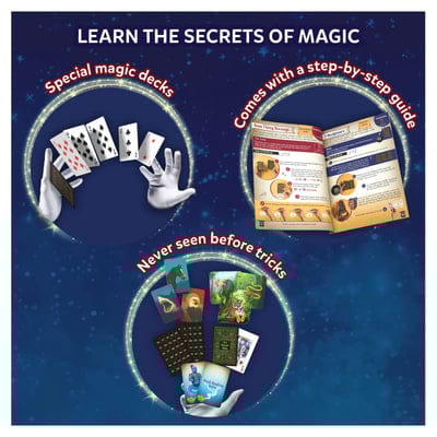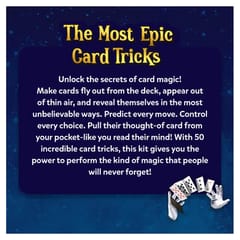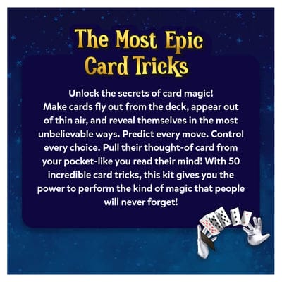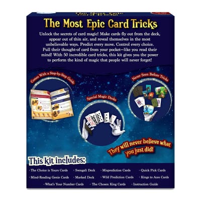 Unlock the secrets of card magic! Make cards fly out from the deck, appear out of thin air, and reveal themselves in the most unbelievable ways. Predict every move. Control every choice. Pull their thought-of card from your pocket-like you read their mind! With 50 incredible card tricks, this kit gives you the power to perform the kind of magic that people will never forget!What’s Inside