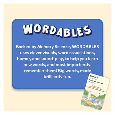 • BACKED BY MEMORY SCIENCE: Designed using proven cognitive techniques—like word associations, visual memory, humor, and sound cues. Wordables supports long-term retention and inspires a love of language.