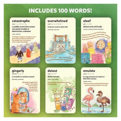• 50 DOUBLE-SIDED CARDS WITH 100 BRAIN-BOOSTING WORDS: Each level 1 card features playful visuals and memorable sentences that make even the most complex words easy to understand and fun to use.